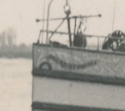 helemaal bij de boeg is een naam te lezen, weliswaar heel klein weergegeven