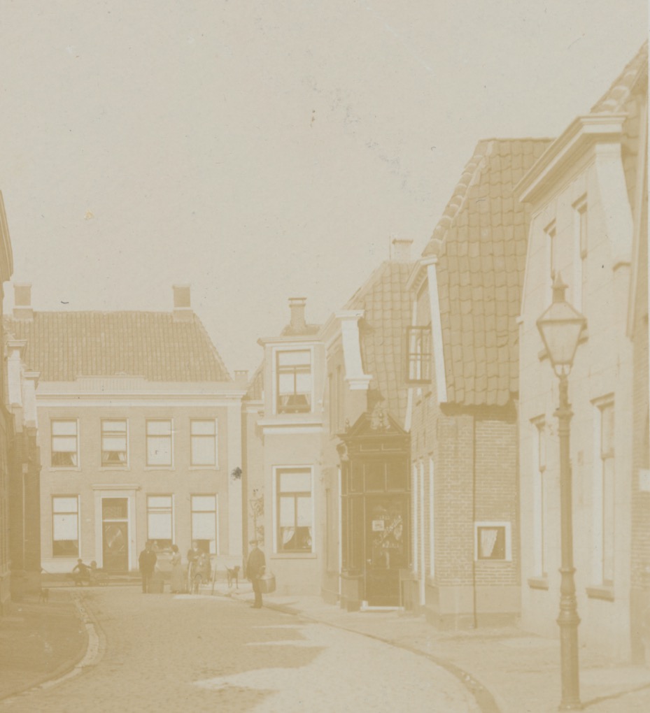 Het is een lastig plaatje vanwege de vervaagde foto en het sterk verkorte perspectief. De straat die op de voorgrond na een bocht naar achter loopt, vormt aan het eind een T-kruising. Veel huizen hebben een 'halve hals-gevel', de ramen zijn schuiframen en de lantaarnpalen zo duidelijk, dat ze er in het kenniscentrum uit zouden moeten springen!