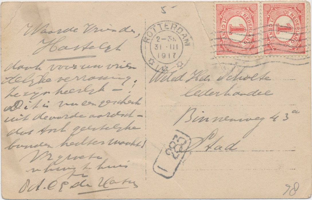 Theo en Harm, een in mijn ogen weer opmerkelijke oplossing. Ook ikzelf ben er een tijd mee bezig geweest, maar kon er geen touw aan vastknopen. Misschien is mijn bewondering voor jullie daarom des te groter. Ik had me geworpen op alle mogelijkheden van de naam van de afzender, die onduidelijk was geschreven. Op de Hertog was ik niet gekomen. Wat knap om de ingang van de buren rechts in het hedendaagse Rotterdam nog te hebben kunnen terugvinden. Op de voorgrond dus de rails van de tram. Een geweldig compliment aan jullie beiden is hier zeker op zijn plaats. Mede namens mijn gast, hartelijk bedankt en ….. hulde.