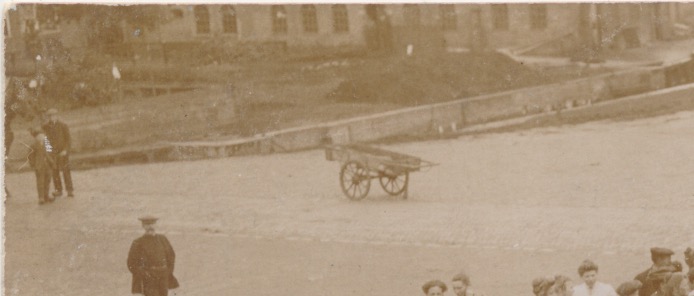 op de kar (hondenkar?9 onderaan de opname een reclame van ??? Slager - veeren en kapokbedden