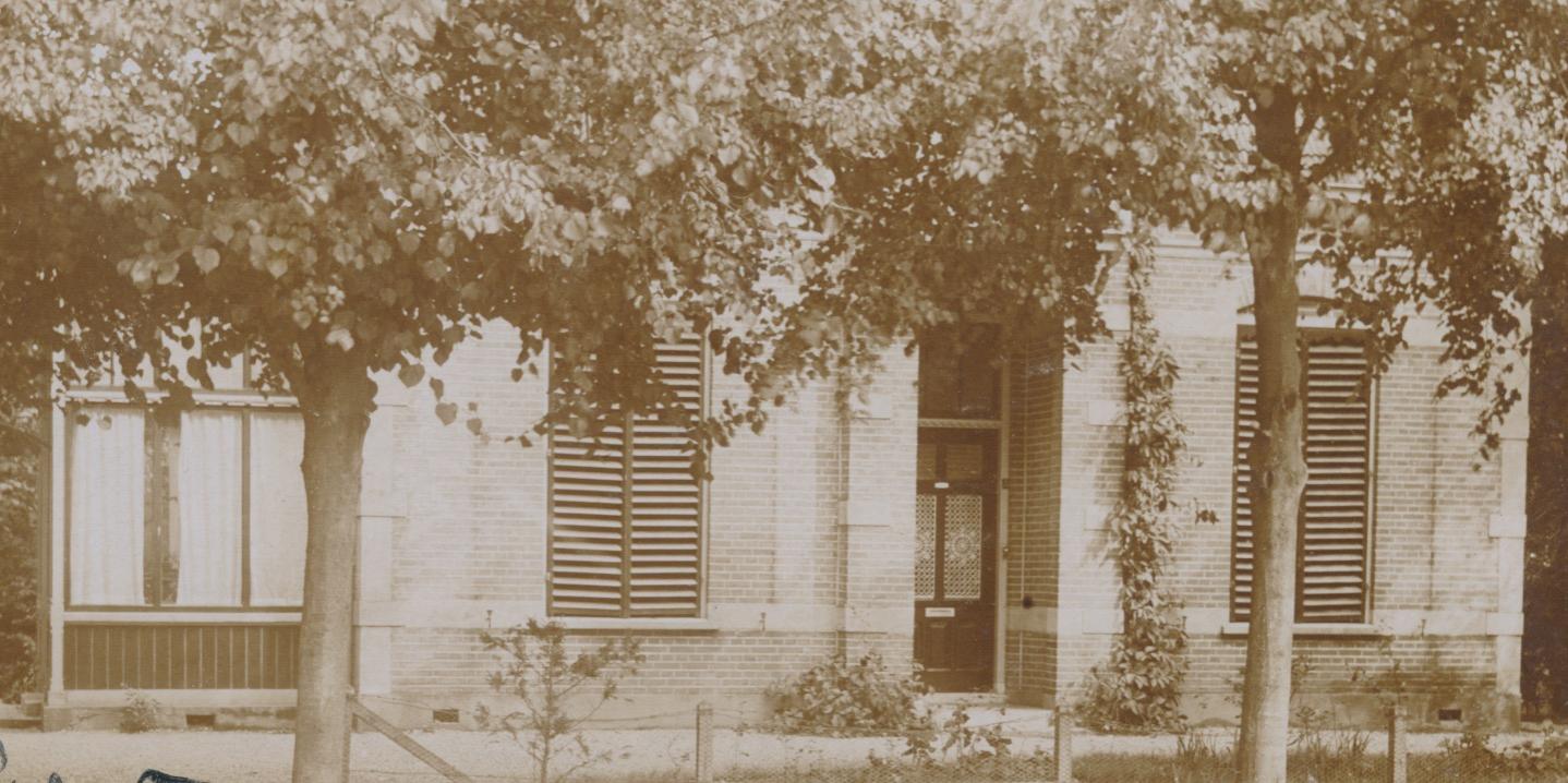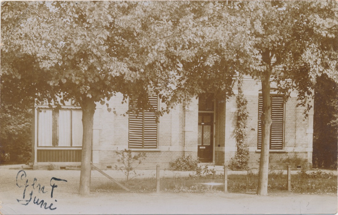 Ik zie in het midden van het pand een gedraaid houtdeel van een balkon, rechts tussen het blad zie ik dakpannen, dit komt overeen met een type huis waar er meer van staan aan de Soerenseweg, (zie o.a. Soerenseweg nr. 80).