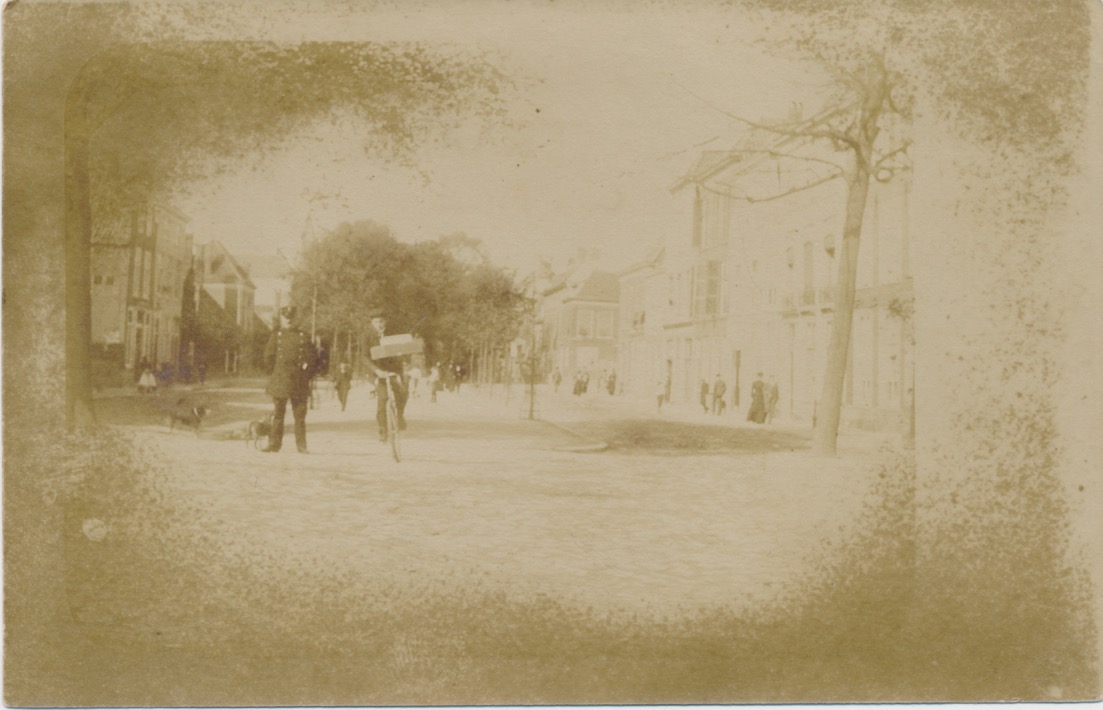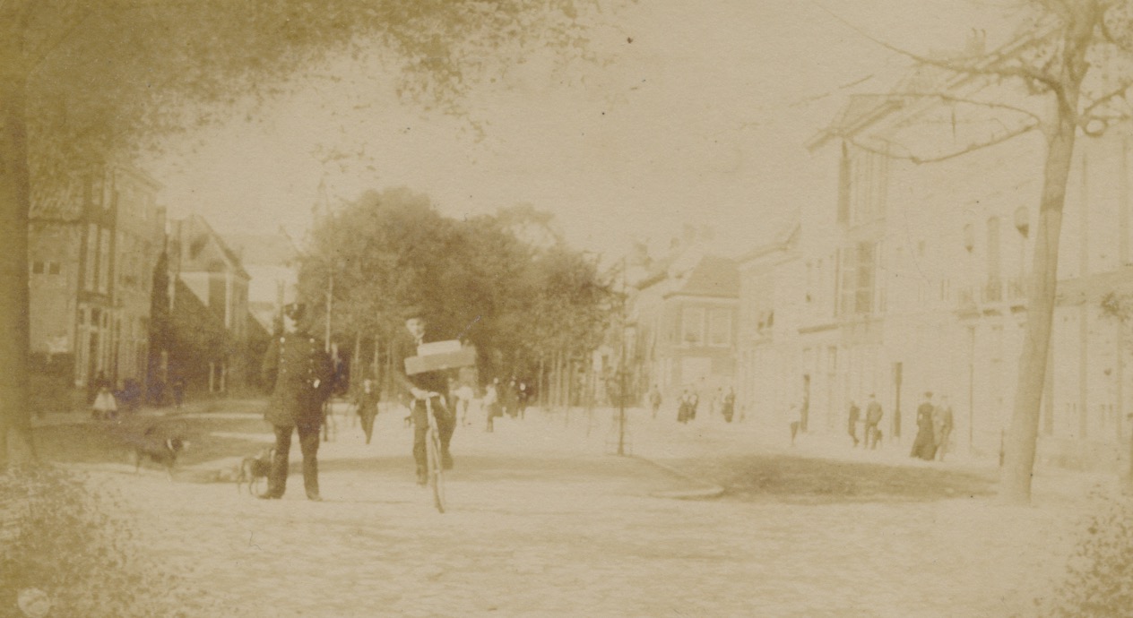 Dit is Den Haag, het zojuist gedempte deel van de Paviljoensgracht tussen singelgracht en Stille Veerkade, gezien vanaf Dunne Bierkade naar Lutherse Burgwal. Verderop, voorbij de hoek met de Stille Veerkade, staan grotere bomen, waaruit blijkt dat het eerste deel van de Paviljoensgracht al eerder was gedempt (ca. 1870). De dozen van de fietser maskeren gedeeltelijk het standbeeld van Spinoza, dat nu enige meters dichterbij staat. Het huis links, geflankeerd door laagbouw, is het Heilige Geesthofje. De twee panden ervoor zijn vervangen door bordelen van de Doubletstraat. Boven de agent en de bomen zien we de gietijzeren torenspits van de Grote Kerk.