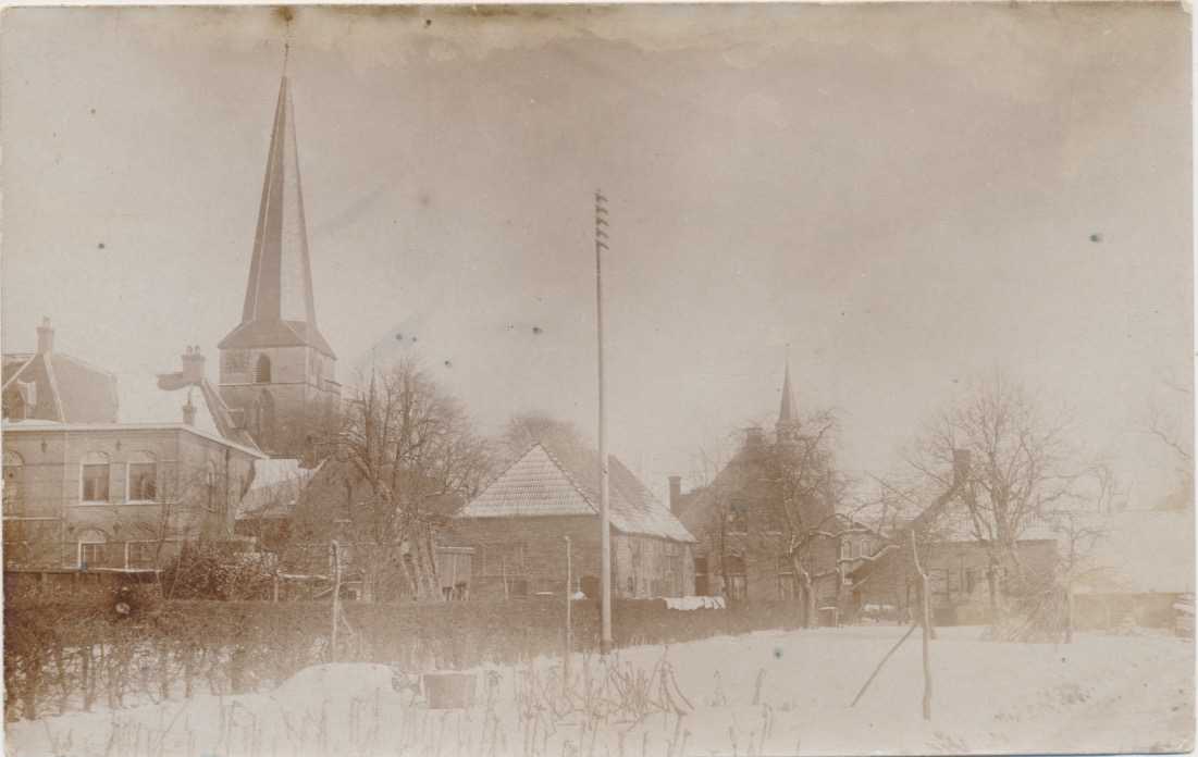 Dit is een dorpsgezicht in Haaksbergen (OV) met links de toren van de St. Pancratiuskerk, de achterzijde van de R.K. pastorie en rechts de koepel van de N.H. kerk. Mooie foto!