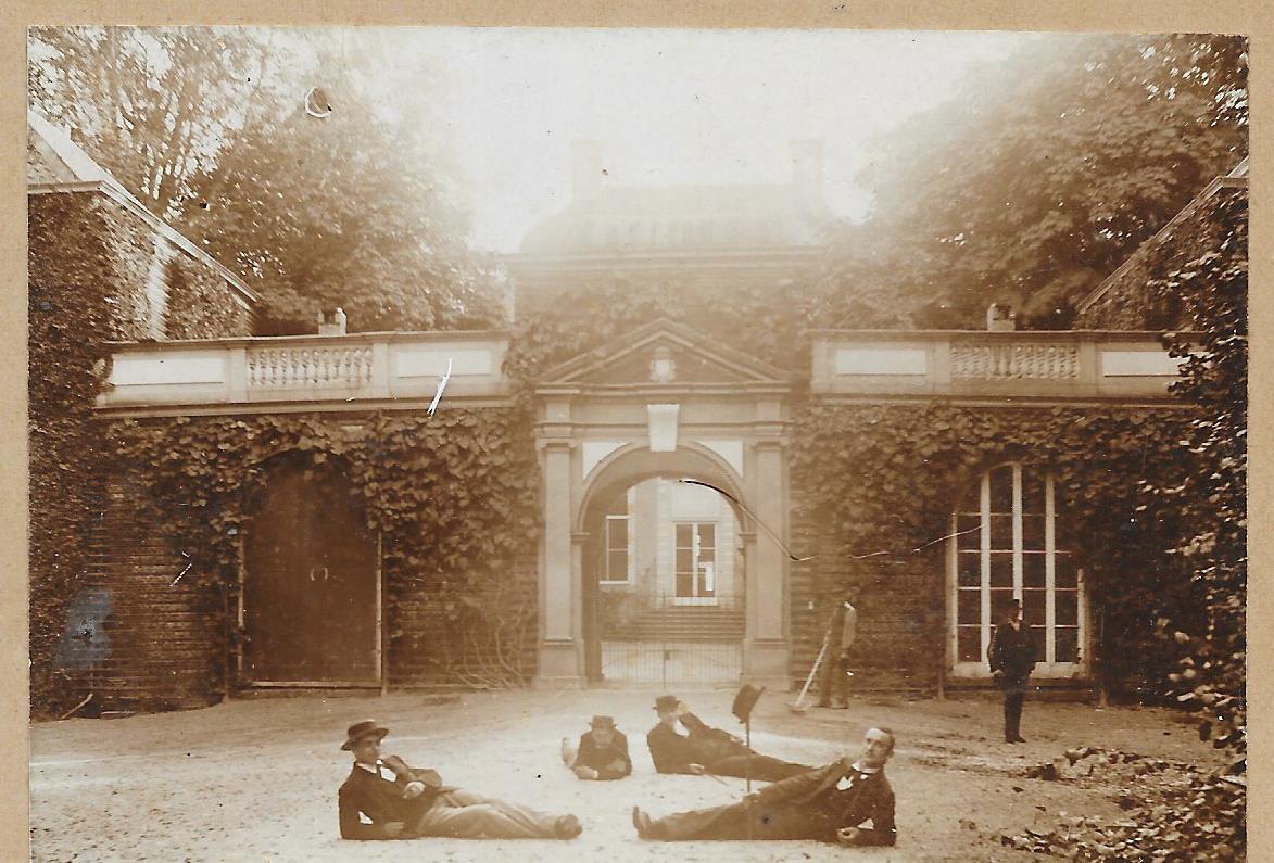 Deze foto tegelijk gevonden met de eerder opgelost school in Leiden . Een medewerker van het archief te Leiden herkend het niet als leiden , maar geeft wel aan dat het waarschijnlijk studenten zijn .De vraag is alleen waar zijn ze ?? Een herenhuis met poort ? een soort universiteit , kostschool , internaat ? Het lijkt zandgrond te zijn en er lijkt hoogte verschil te zitten in de grond ?