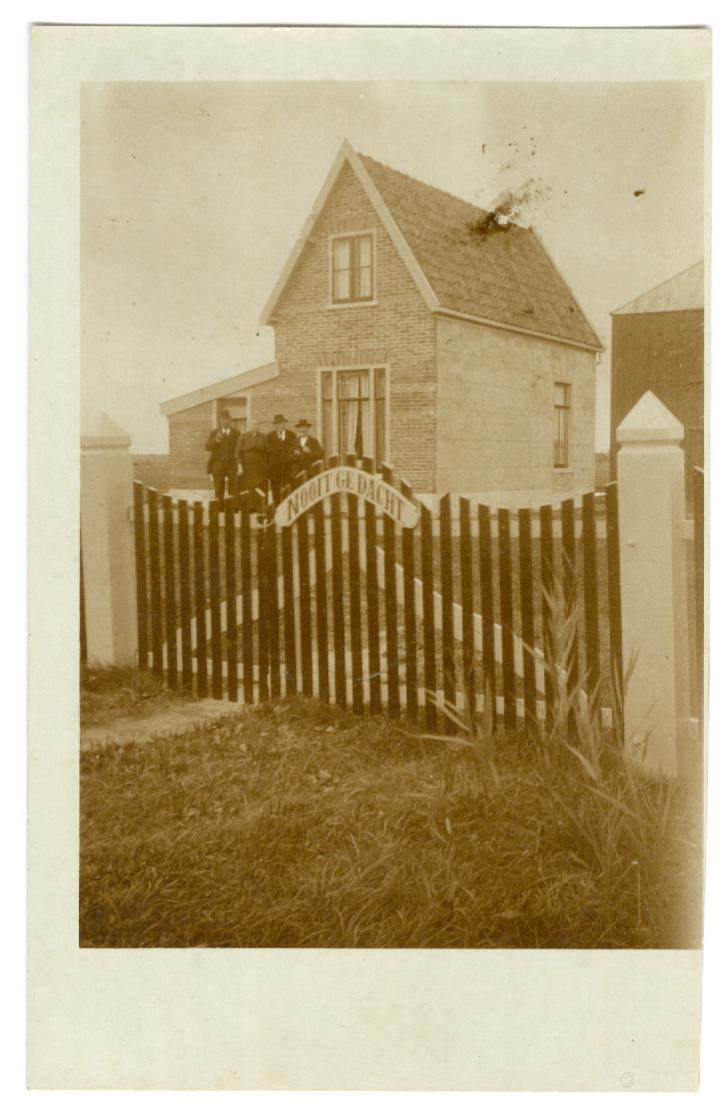 Belijnde achterzijde onbeschreven. Op het hek de naam “Nooit gedacht”