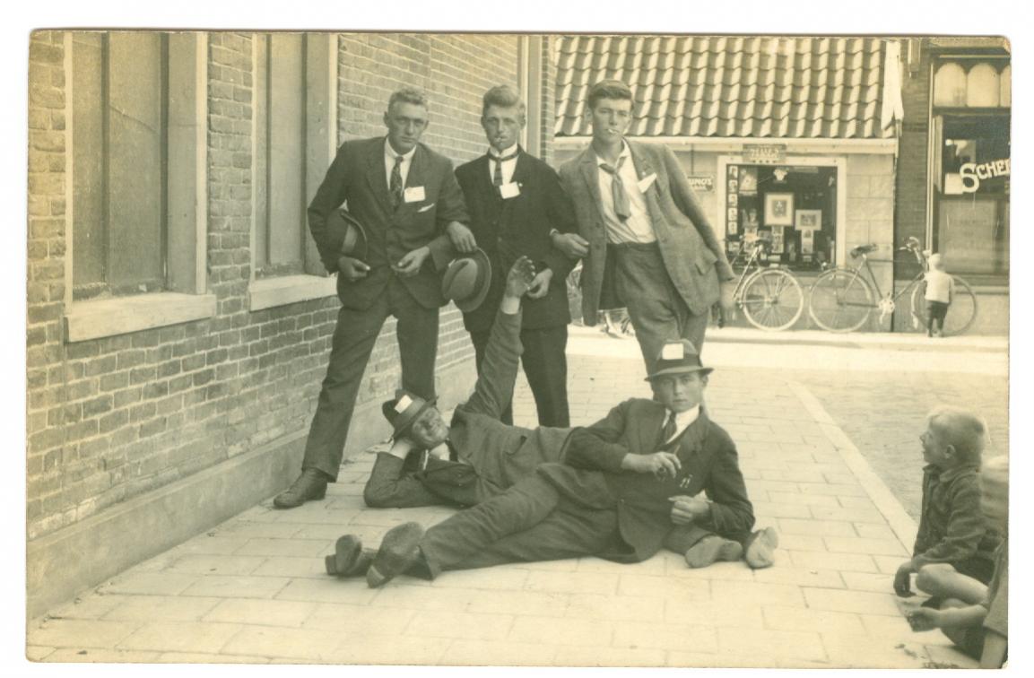 5644g vijf mannen "lotelingen, winkel op achtergrond - HJK