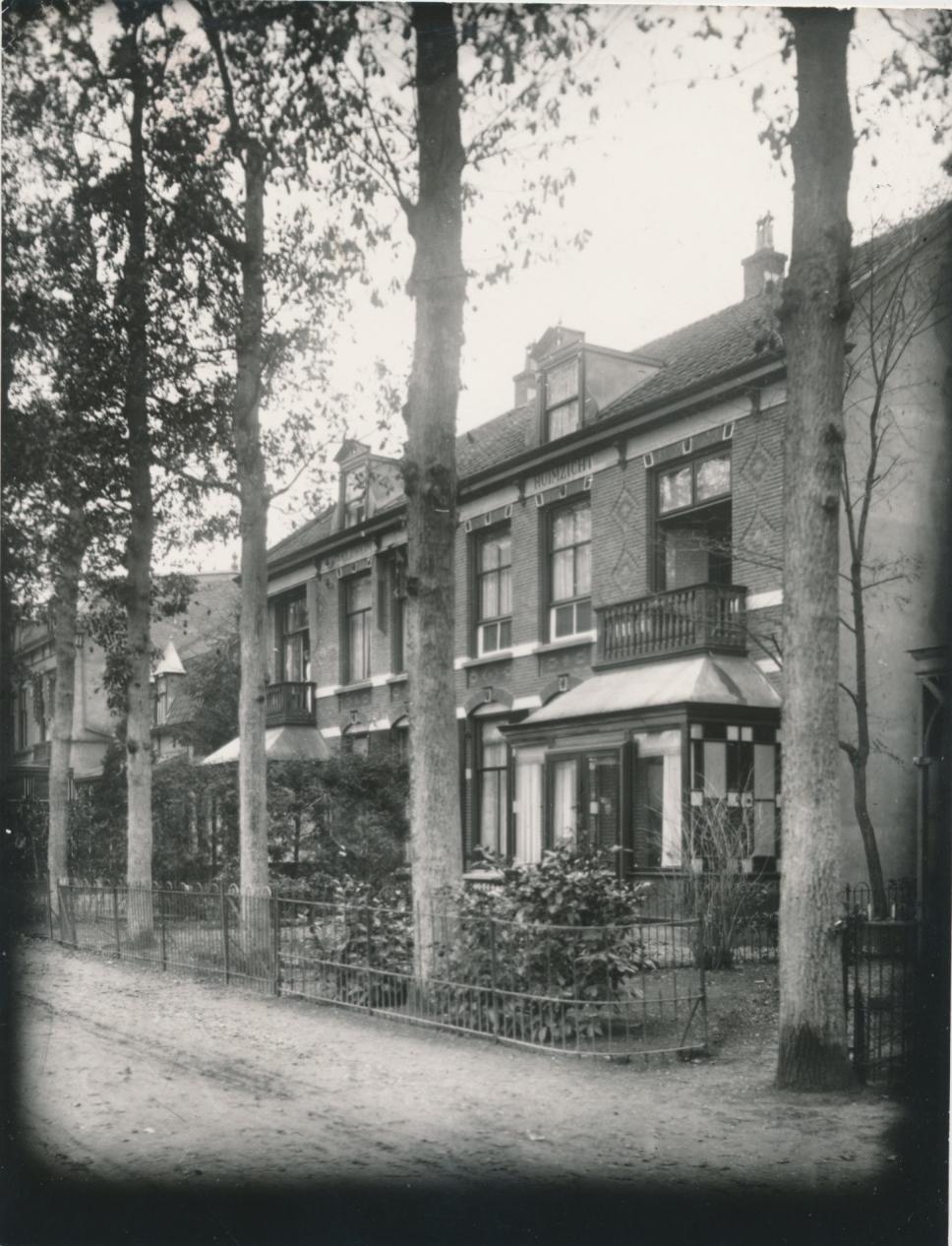 Een laan/straat/weg met hoge bomen. Heel vreemd dat de tuinhekken de bomen bij de tuin betrekken en niet 'achter' de boomstammen lopen.