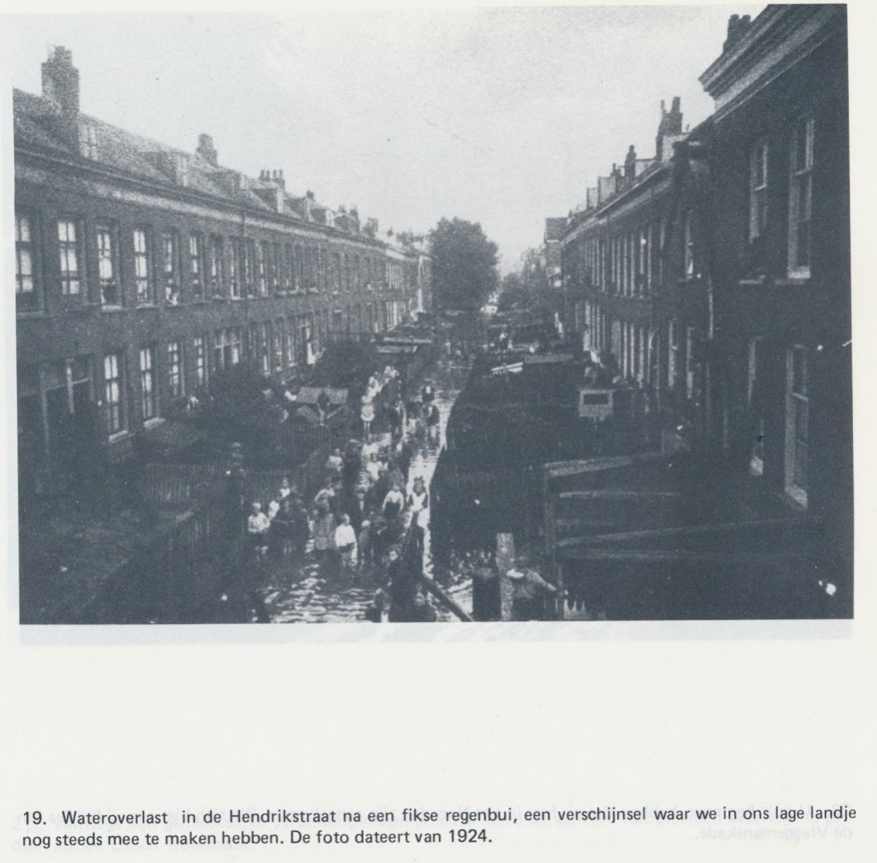 Wateroverlast in de Hendrikstraat na een fikse regenbui, een verschijnsel waar we ons in ons lage landje nog steeds meer mee te maken hebben. De foto dateert van 1924. Opname 19 uit: Rotterdam, stad van mijn moeder van Anneke Mekes uit 1983.