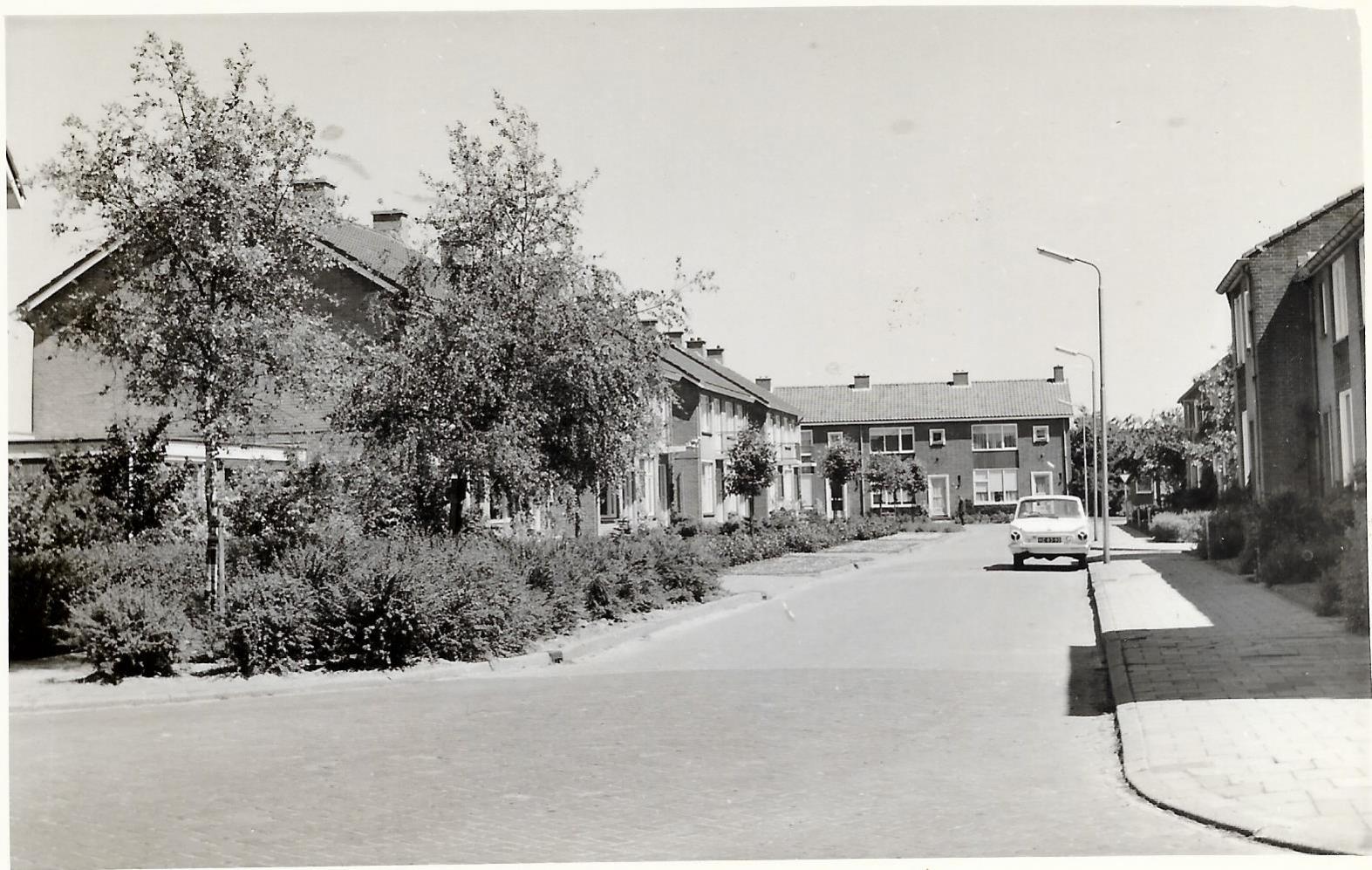 Blok rechts eengezinswoningen waarvan de voorgevels van beide hoekwoningen vooruitspringen. Zie daarvoor de schaduw van het blok op de straat. De hoekwoningen zijn ook iets hoger opgetrokken. Direct voor de lichte auto een zijstraat naar rechts. Voor het blok waar we tegen aan kijken waar de man staat ook een zijstraat naar links. De weg loop dan schuin weg naar rechts. Ook op de voorgrond is te zien dat de weg ook schuin wegloopt, maar dan naar links.