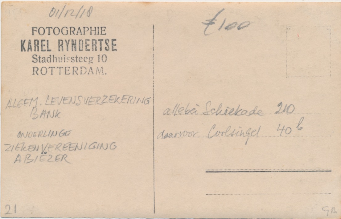 belijnde, ongelopen fotokaart. Toen ik de kaart aanschafte, dacht ik in eerste instantie aan de Diergaardelaan. Op zoek naar een bewijs stuitte ik op andere adressen. Op de achtergrond valt aan de gevel te lezen: Algem. Levensverzekering Bank met ernaast de [Onderlinge] Ziekenvereeniging Abiëzer. De adresboeken Rotterdam geven deze ondernemingen altijd op hetzelfde adres. Ik vond Schiekade 210 en daarvoor Coolsingel 40b. Maar een middenberm met bomen kan ik daar niet vinden. Nu zit ik dus met mijn handen in mijn nog weinige haar. Wie neemt mij bij de hand naar een meer voor de hand liggende lokatie? Wat opvalt zijn de rijk geornamenteerde ingangen. Ik lever graag op verzoek nog detailscans.