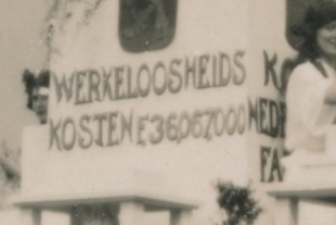 In ieder geval in Den Haag Optocht ter gelegenheid van het 25-jarig regeringsjubileum van koningin Wilhelmina. 31 augustus 1923. Praalwagen van de Vereniging Nederlands Fabrikaat. 'Koopt Nederlandsch Fabrikaat', 'Werkeloosheidskosten F. 36.067.000