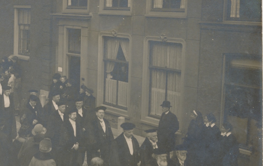 De voordeur is van Kloksteeg 19, Leiden. Dit is waar de Kloksteeg uitkomt op het Pieterskerkhof. De foto is genomen vanuit de verdieping van Kloksteeg 14, hoek Pieterskerkhof. Zie https://www.google.nl/maps/@52.1571979, ... 4!8i8192.:)