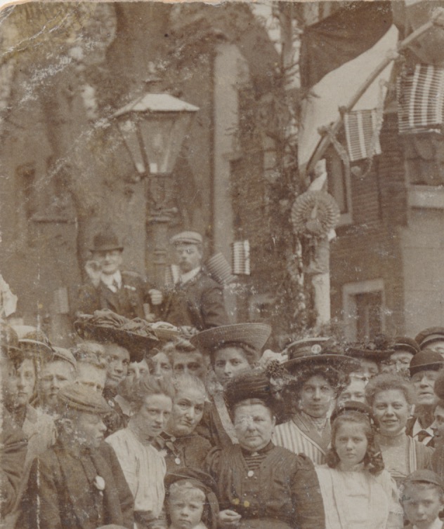 Niet simpel! Ik vermoed dat dit geen Koninginnedag is, maar een onthaal: op de ballonnen zou 'welkom' kunnen staan. Een Nederlandse vlag is zichtbaar. Ontvangst van een nieuwe burgemeester?