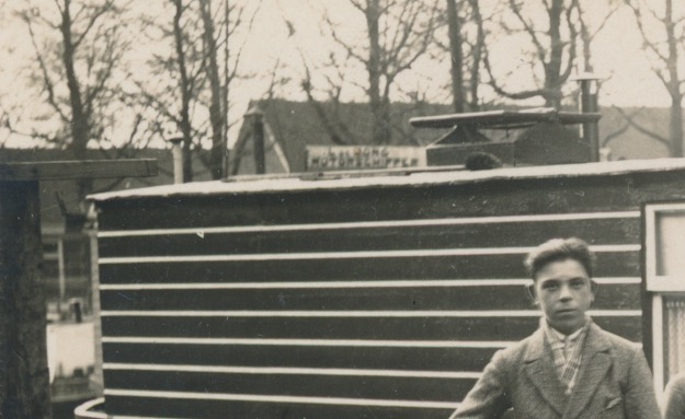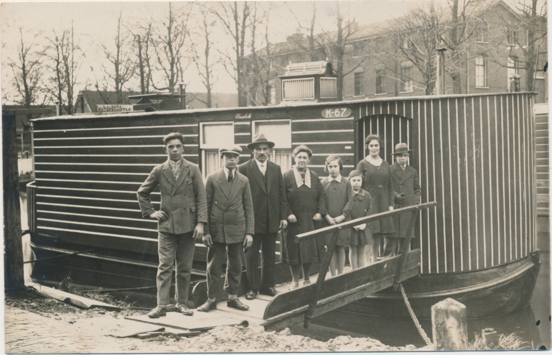 op de achtergrond links, net boven de woonboot uitstekend, een bordje waarop: L. de Jong motorschipper