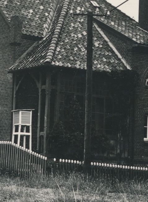 de hoek van de woning valt terug en daar is een houten overkapping gemaakt