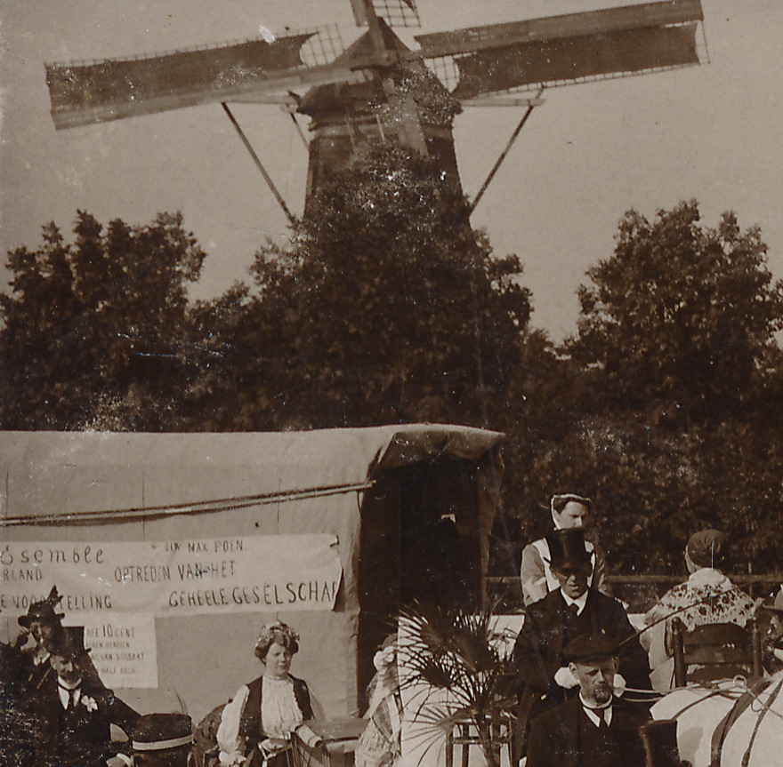 3164 is volgens mij de koren- en pelmolen “De Basuin” te Huizum, wat nu bij Leeuwarden hoort. Ik heb ook andere afbeelding van dit feest met de molen erop. De molen werd in 1913 onttakeld tot op de stenen onderbouw.