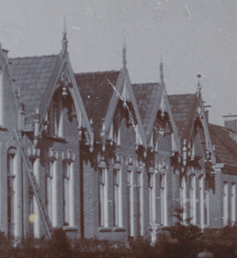 huisjes 5 t/m 8 zijn ook nagenoeg identiek aan elkaar en hebben ook opvallende versieringen onderaan de daklijsten
