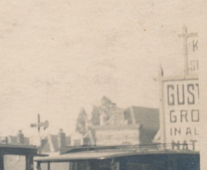 rechts een reclamebord met de naam GUST .... en eronder GRO[othandel?] of GRO[ssier] in AL ... MA.......