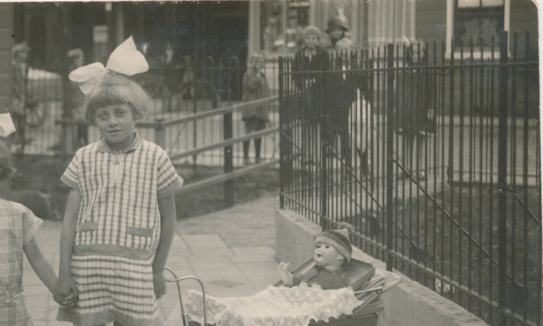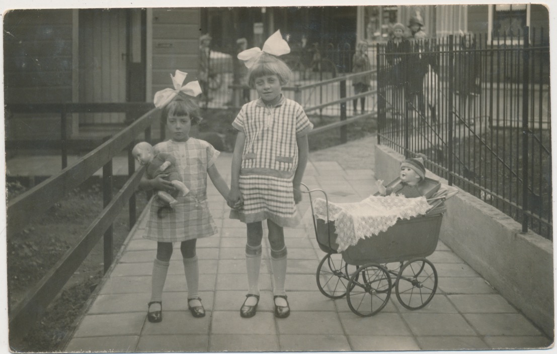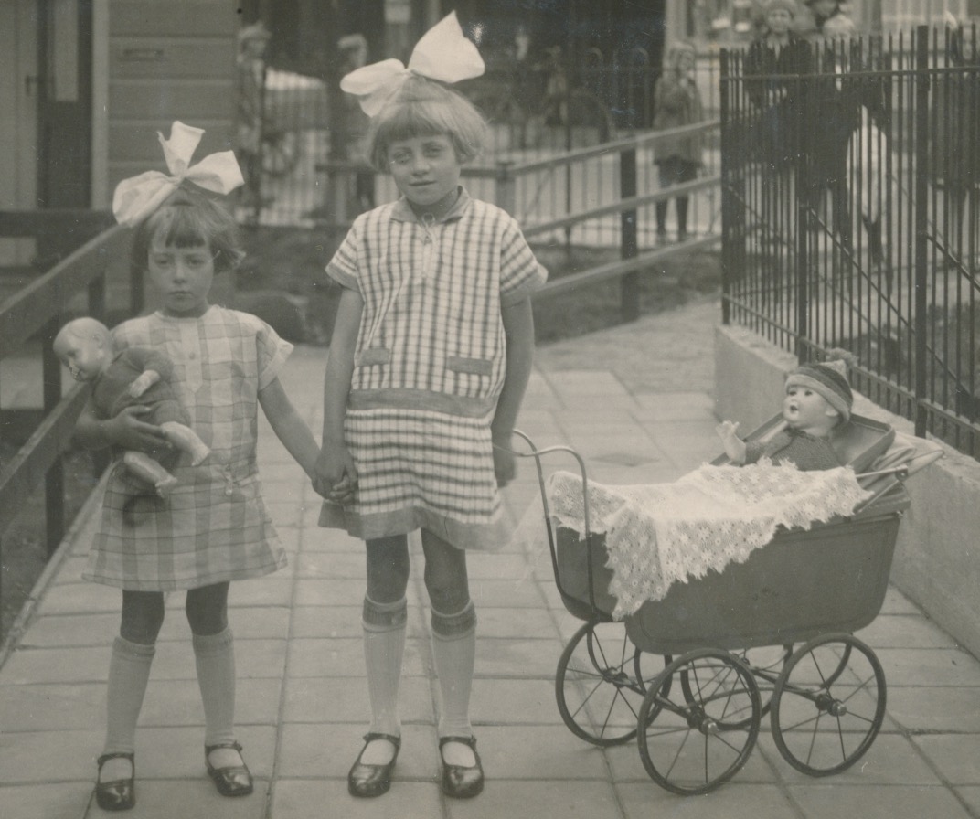 strikken in het haar, twee prachtige poppen, poppenwagen (de meisjes heten naar alle waarschijnlijkheid Truus en Trien, zullen wel zusjes zijn gezien de alliteratie)