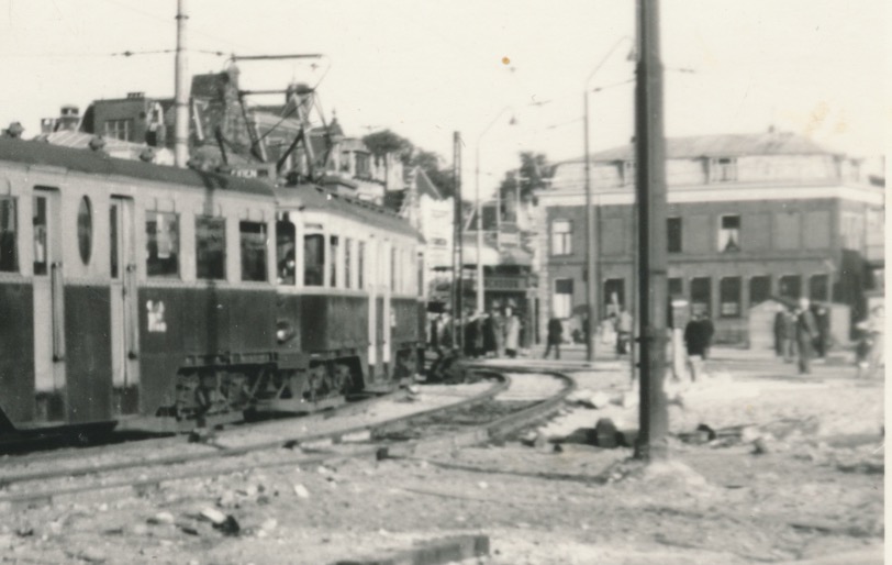 foto 14,7 bij 10,2 cm. van Blauwe Tram F bovenaan Leiden, eronder Leiden Haag