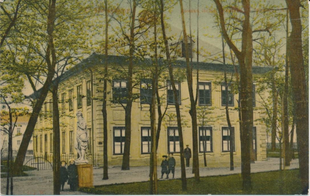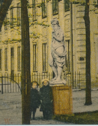 6676 vrijstaand pand met ervoor een beeld op een sokkel 1908