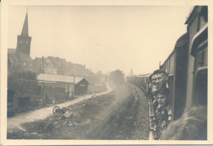 6746 foto dorp met kerk vanuit rijdende trein, Duits beschreven