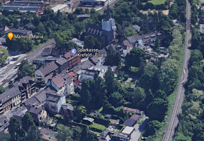 Spoorlijn bij Krefeld-Oppum, huizen Hochfelder Str. en Hauptstr., Engelbewaarderskerk