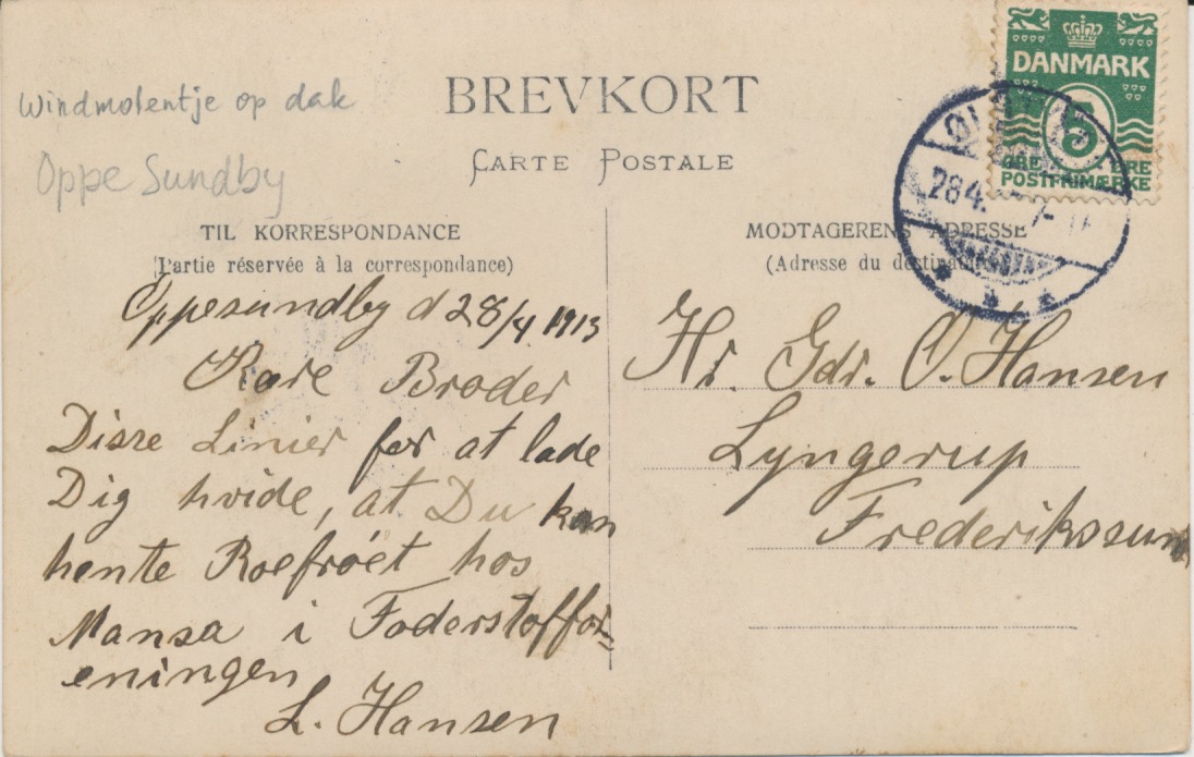 belijnde, gelopen fotokaart met stempel Oppen Sundby 1913