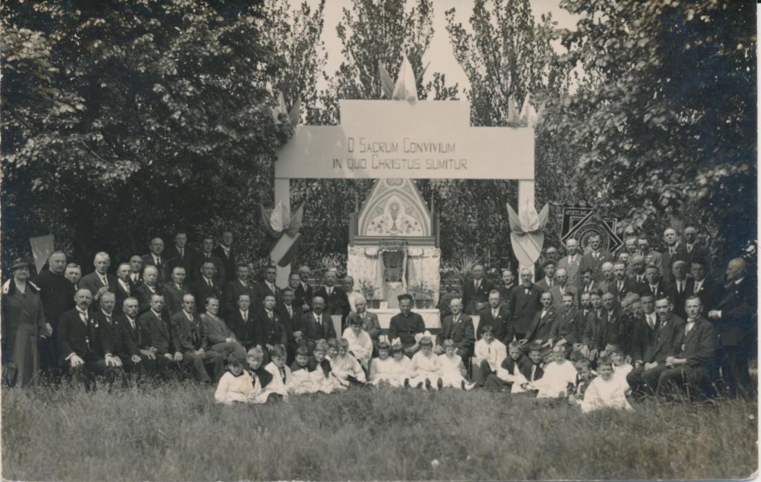 6807 gezelschap bij altaar in tuin met tekst, ernaast ook teksten