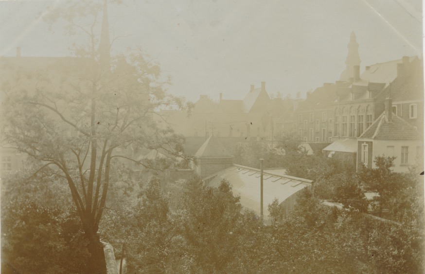 Theorie: dit is op het terrein van de Crombeenschool ofwel het klooster van de Franciscanessen, en zien we rechts de achtergevel van François Benardstraat 86. Dit gebouw is uit 1886-1888. De gebouwen aan de Tentoonstellingslaan zijn pas uit 1909-1911, want toen werd die laan pas aangelegd. Het bouwblok was dus groter tussen die tijden. Links dan de kloosterkapel met torentje, die er volgens mij nog zijn.