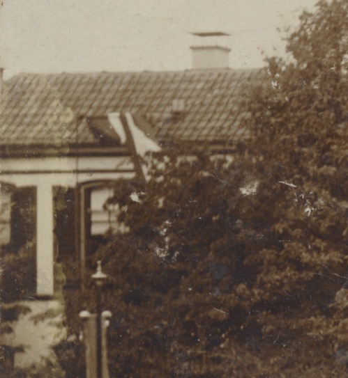 ongelopen fotokaart van dorp met grote mensen massa met 2 vaandels