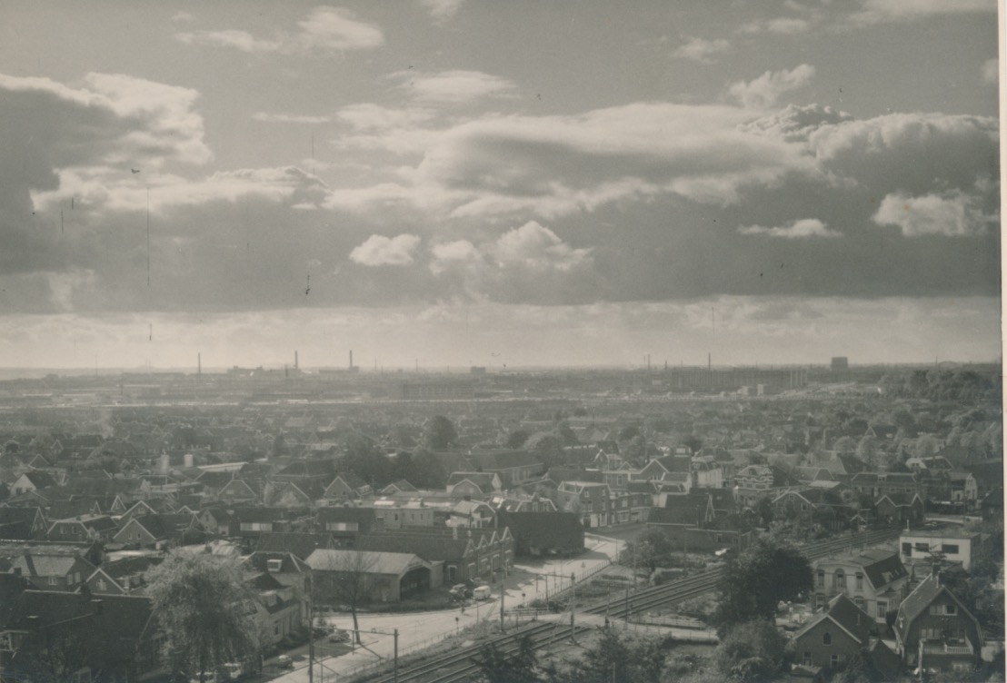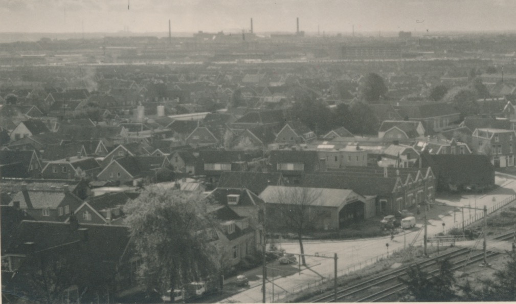 op de voorgrond een spoorbaan met overweg, links ervan een loods met opschrift