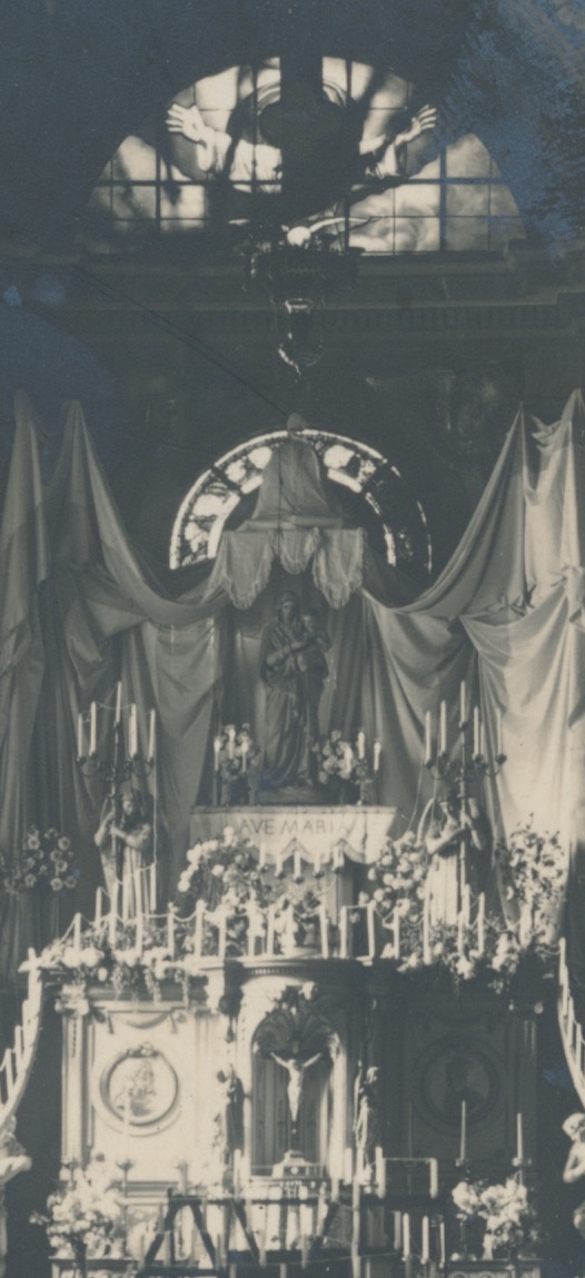 onder het Mariabeeld staat: AVE MARIA, aan beide zijden van het altaar vanen waarop een M