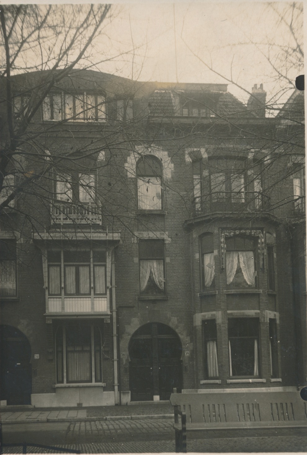 De eerste van vijf houten erkers op https://haagsgemeentearchief.nl/mediabank/beeldcollectie/detail/96d057ba-9216-150a-00ab-affb10ede058/media/9980dfb1-2ec4-ee1e-c86f-01b1f9a8793d. De houten erkers markeren de tussenbouwen. Architecten: W. Molenbroek en H.J. Hoelen.
