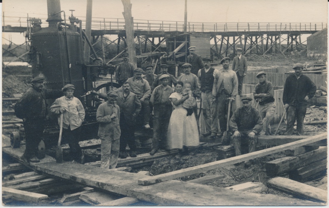 Re: 7238 arbeiders, grondwerkers, stoommachine, geïmproviseerde brug