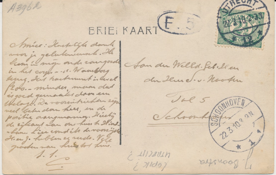 belijnde, gelopen fotokaart met zegel 2 1/2 cent, stempel 1910 Utrecht