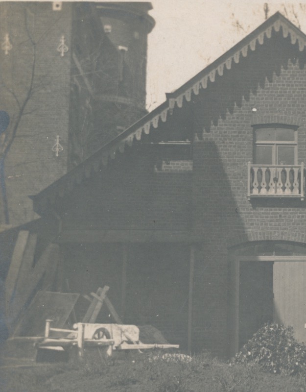 7298g huis met geschulpte dakrand naast ronde toren - JBI