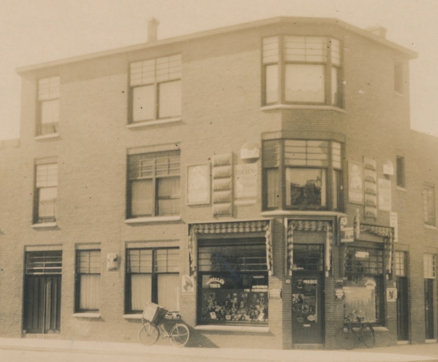de kruidenierswinkel rechts op de hoek met nr. 10, witte cijfers op donkere ondergrond, verkoopt o.a. Van Nelle's thee