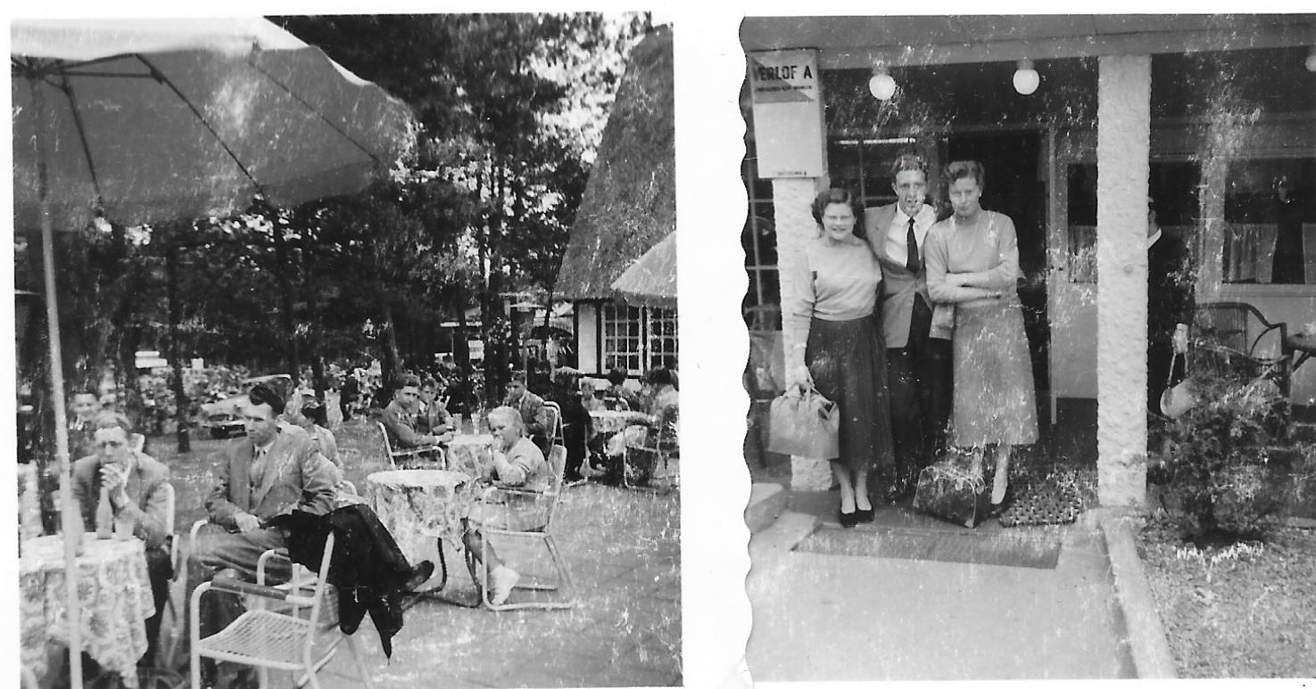 foto,s van een uitspanning met nagenoeg verticale rieten dak in een bosomgeving . Verlof A bij ingang .