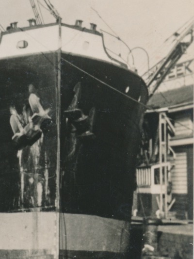 schip aan de kade RHEIN, man bij touwladder op de Petronella
