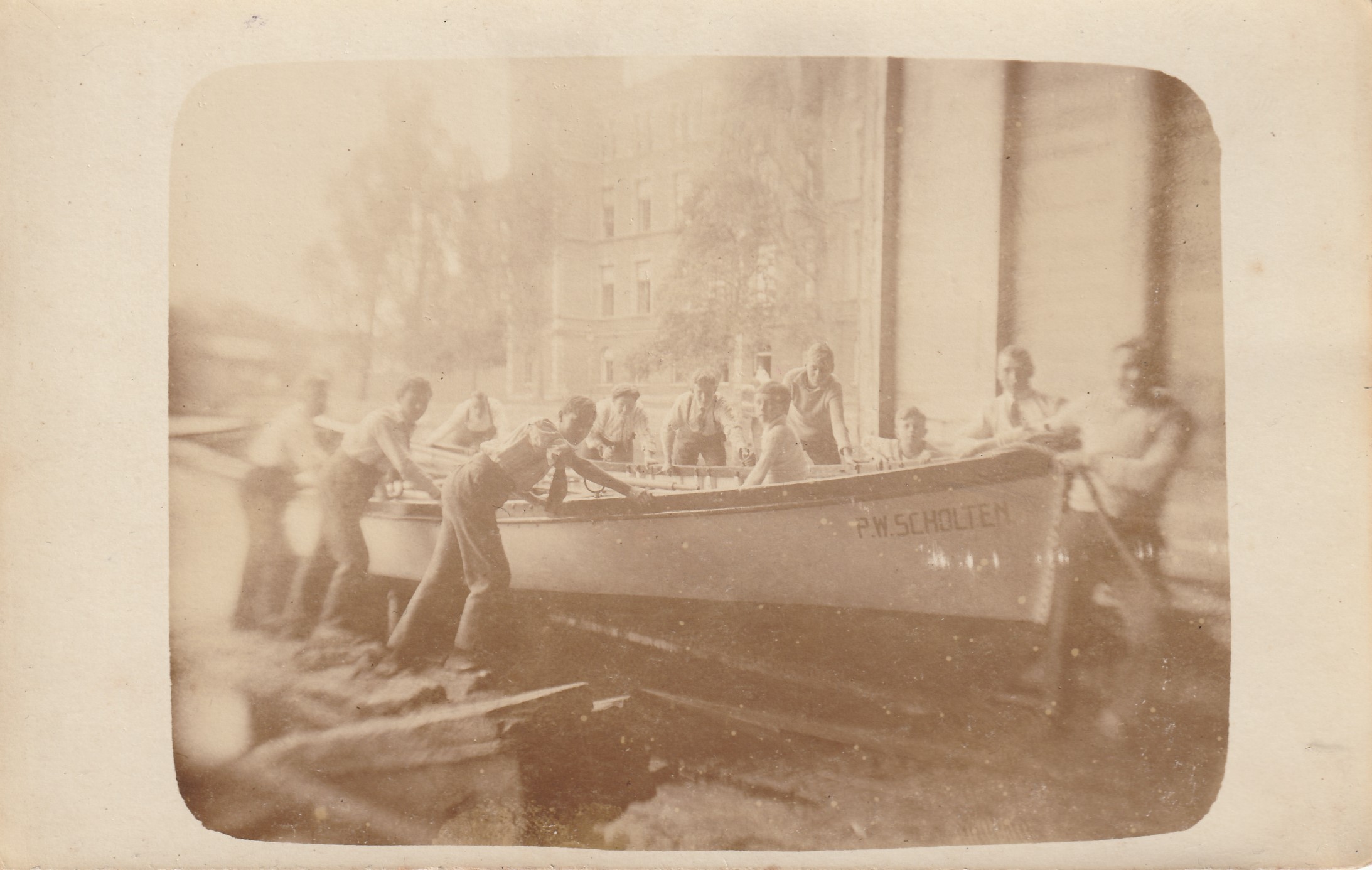 2 fotokaarten van een boot genaamd P.W.Scholten, met pand op achtergrond