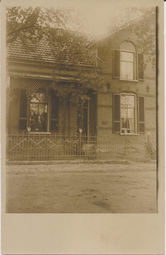 huis met muurankers, luiken, hekwerk met versieringen, onleesbaar naambordje