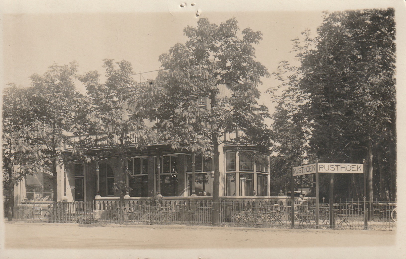 Met de loep is er meer info te vinden over dit plaatje .. Veel reclame voor Amstel pilsener, een uitspanning /cafe met terras . Links zit een winkel,,, .???..Handel ,,met in het Raam de naam C.T.... en tel.... . Rademakers hopjes . De winkel heeft huisnummer 60 !! Rusthoek heeft dan mogelijk ook nr 60 of ander 62 / 58 . De winkel doet een dorp vermoeden , maar rechts zien we duidelijk bos . Verder vind ik de overeenkomst met Cafe graaf floris te vogelenzang https://www.google.com/maps/@52.3243996 ... ?entry=ttu wel opvallend , maar dan kan ik het huisnummer weer niet inpassen ...Al met al leuk zoekplaatje ..