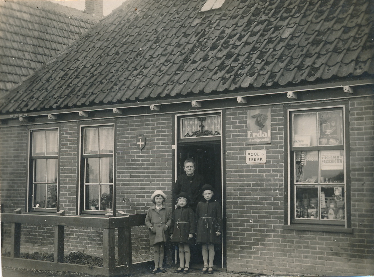 Uitgeknipt deel van een belijnde ongelopen prentbriefkaart. Huisnummer 92 of 192, de 1 zou ook een letter kunnen zijn. Reclamebord van Pool’s tabak, kwam volgens mij uit Hoorn.