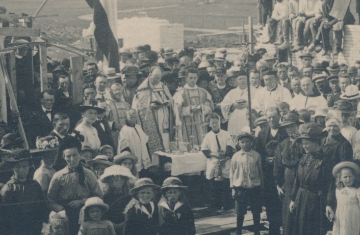 Nu de molen bekend is kan ook achterhaald worden ter gelegenheid waarvan deze foto gemaakt werd. Het betreft de eerste steenlegging van de R.K. Wulframkerk op 20 juli 1921.