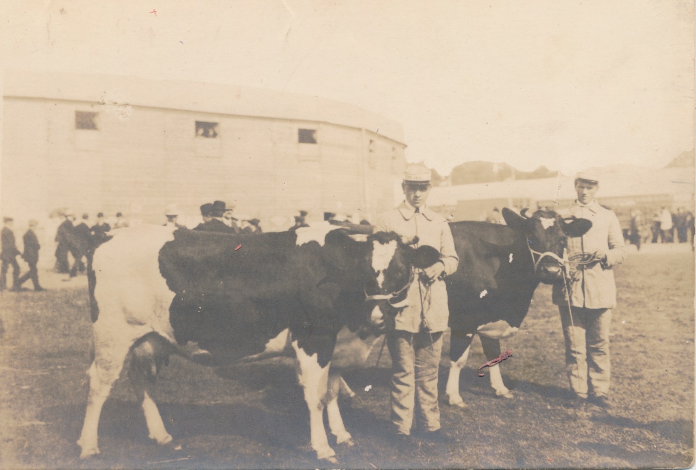 Mogelijk een vee - landbouwtentoonstellings terrein, met 2 keurmeesters aan het werk ?