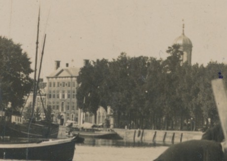 op de andere oever een classicistisch aandoende pand, rechts ervan een koepeltje