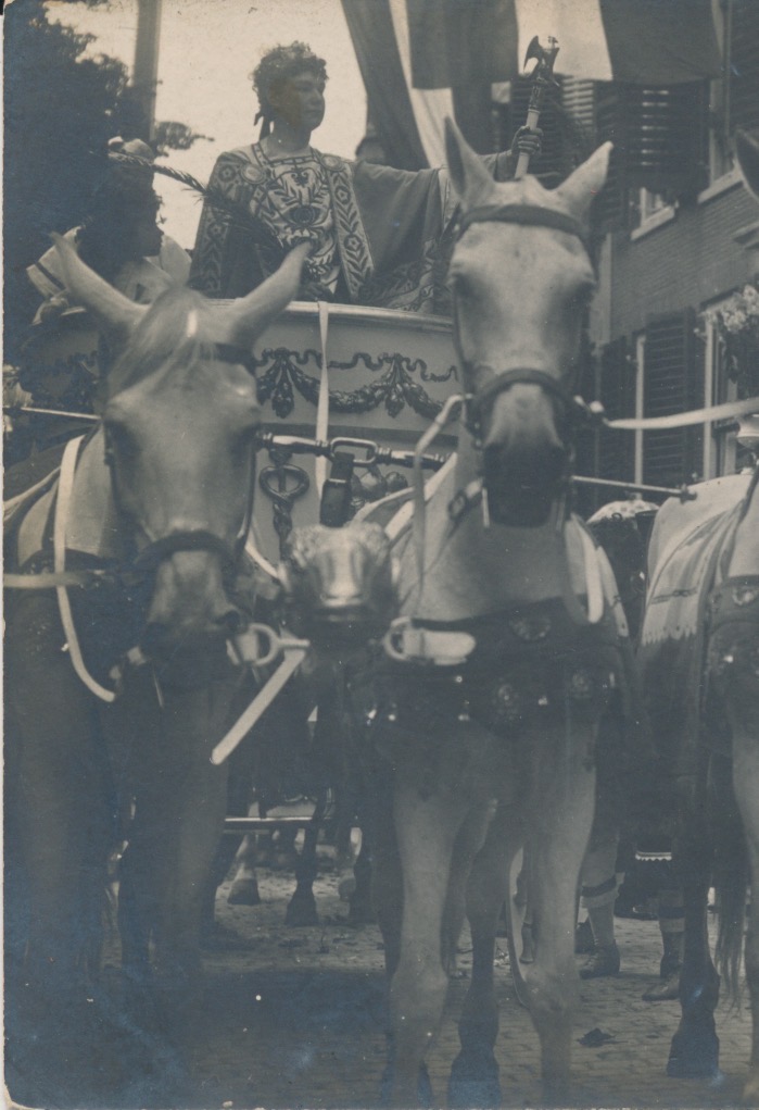 Afbeelding van Germanicus, hoofdpersoon in de maskeradeoptocht met als thema De triomftocht van Germanicus binnen Rome in 17 na Chr. ter gelegenheid van het 54e lustrum (270-jarig bestaan) van de Universiteit (25 juni -30 juni 1906). Germanicus reed in zijn zegekar met vier schimmels een triomftocht door de Utrechtse binnenstad. Ze staan hier voor de versierde voorgevel van het huis van de hoofdpersoon uit de maskerade, H.B. VerLoren van Themaat, Nieuwegracht 56 te Utrecht.