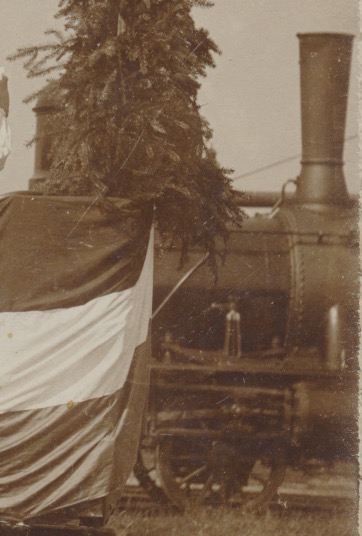 op de achtergrond een deel van een stoomlocomotief