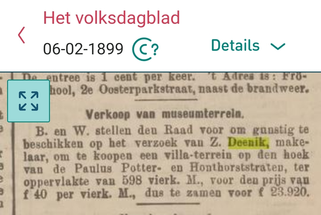Makelaar Z. Deenik & Zn. in een artikel over een terrein aan de Paulus Potterstraat/Honthorststraat.
